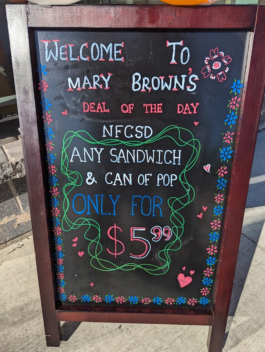 it was great experience ordering and eating from this marry browns location. Awesome customer service. Also i have to say that Roop has the best customer service she is super friendly and polite and always get my order right. Definitely coming back soon!